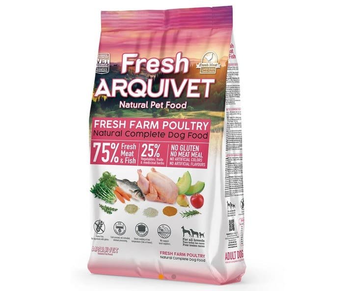 Aliment complet semi humide pour chiens adultes, composé de 55 % de poulet frais, 20 % de poisson et 25 % de légumes, fruits et plantes médicinales. Pressé à froid, non extrudé, avec un minimum de transformation. Ingrédients 100 % naturels, sans gluten, sans farine de viande, sans colorants ni arômes artificiels. Cuisson lente à basse température.Élaboré avec des ingrédients 100 % naturels, sans gluten, sans farines de viande et sans colorants ni arômes artificiels. Cuisson lente à basse température.