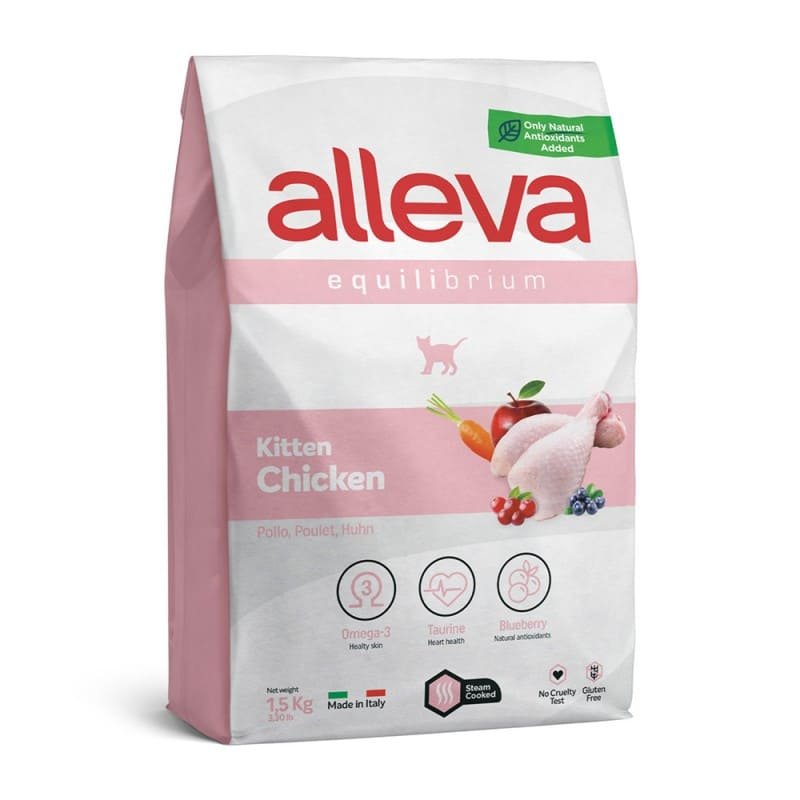 Croquettes Super Premium complètes sans gluten Alleva Equilibrium pour chaton, chatte en gestation et en lactation.
